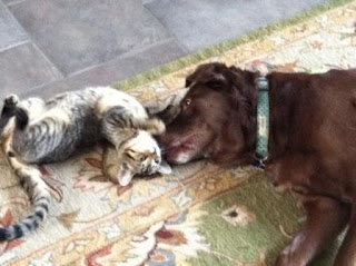 DeleteI am absolutely amazed at how gentle he is with these kittens... and what a goofball he is when they're around. He's becoming a bit of a pest when they're locked up. Begging for them to be let out to play.